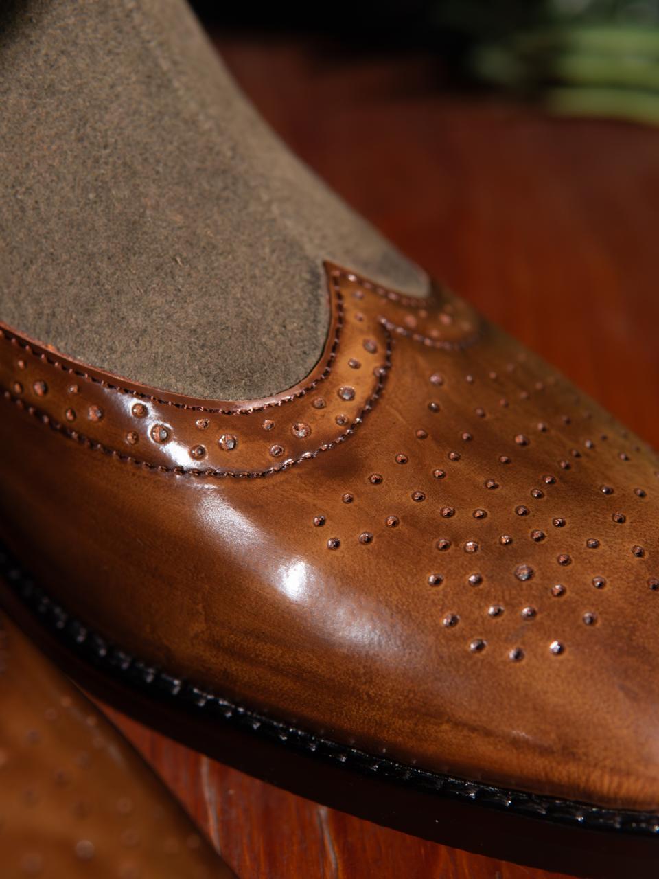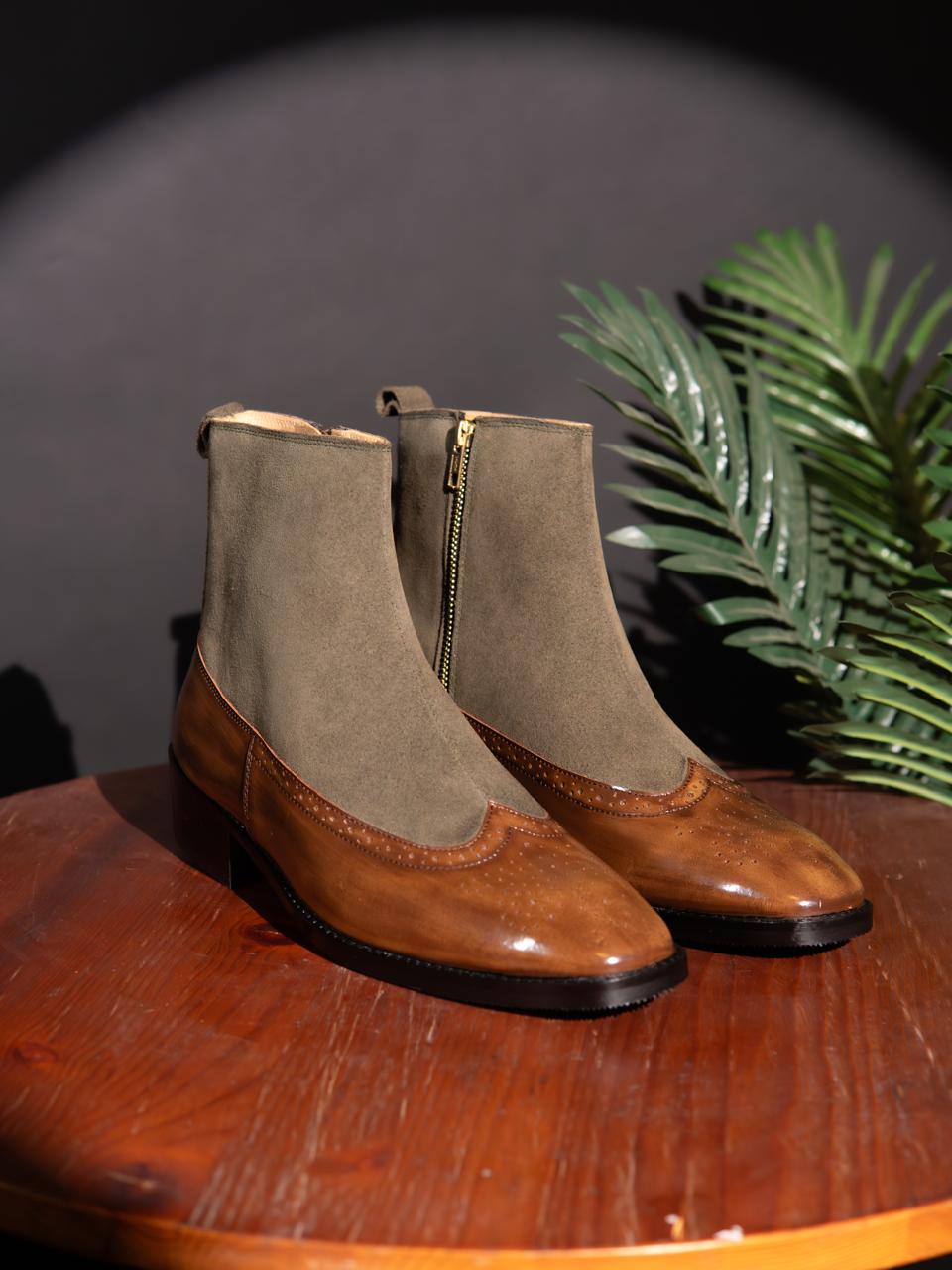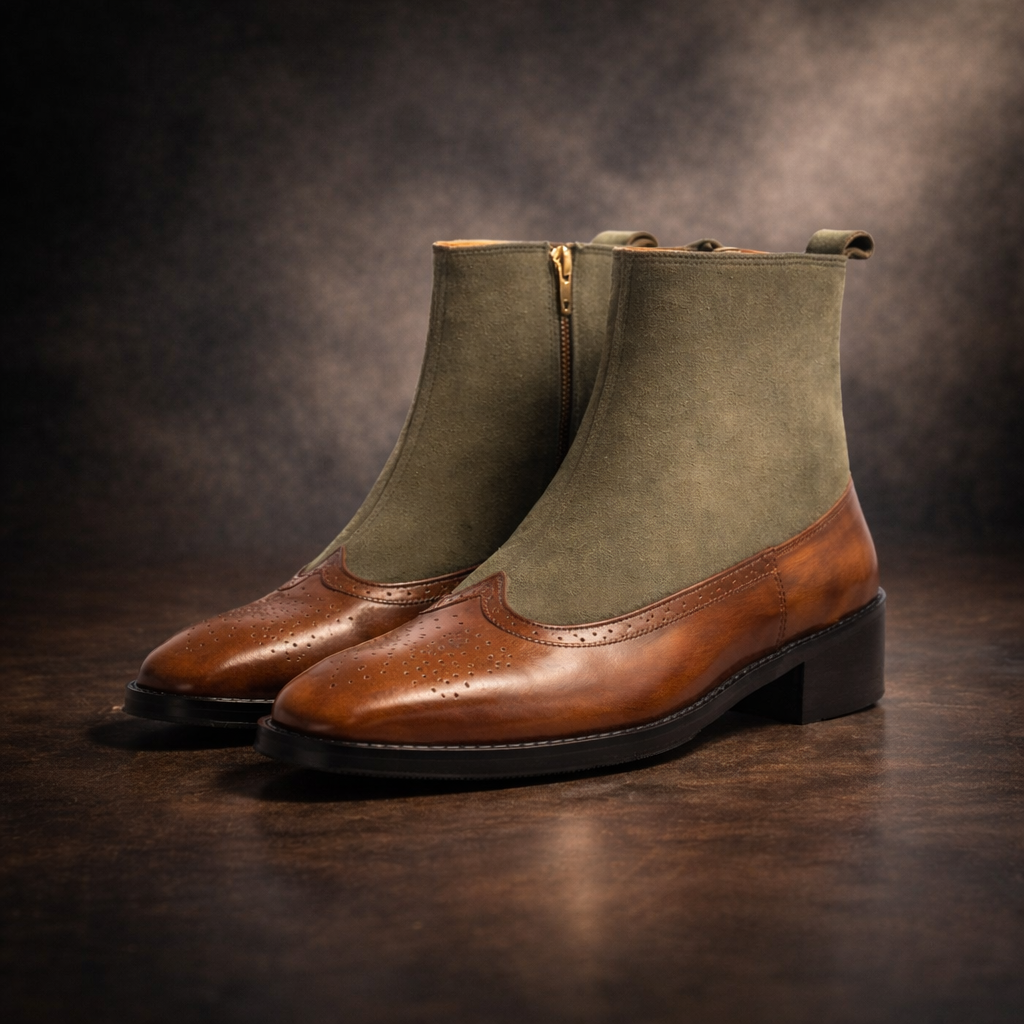 The Ashford brings together rich burnished leather and premium suede in a silhouette designed for quiet authority. The brogue-detailed toe adds character without excess, while the clean shaft and Cuban heel deliver a sharp, confident stance.